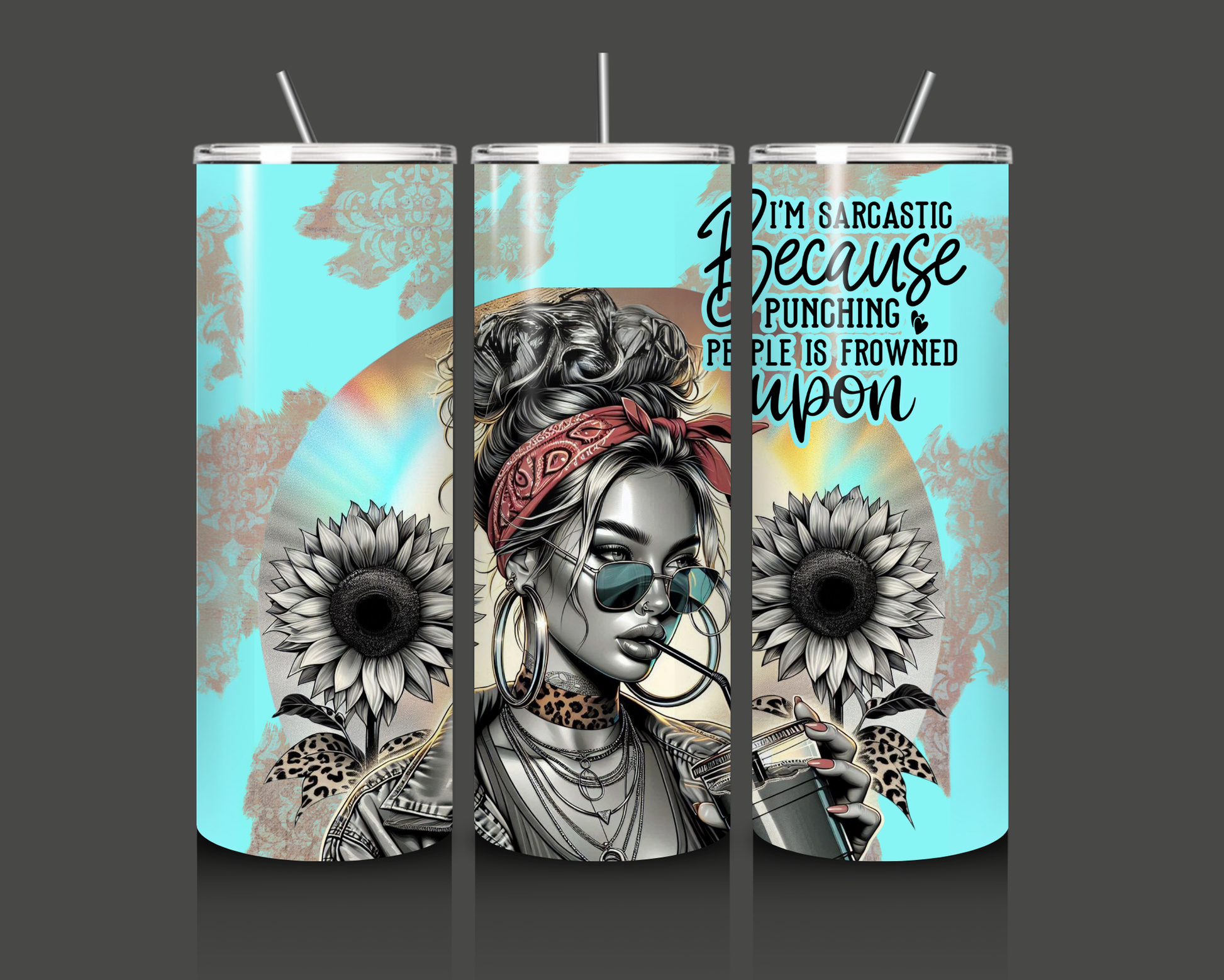 Set against a radiant turquoise background with vintage damask-style accents and sunburst halo, the tumbler is framed by two large, detailed sunflowers and edgy leopard print leaves for a fierce touch of flair. The humorous quote, "I'm sarcastic because punching people is frowned upon", adds just the right dose of sass to your everyday sip.
